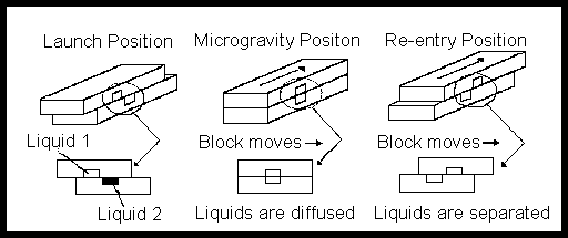 The unit operates on the following principle: two blocks of inert polymer material each with test well cavities in the upper and lower blocks are held together in an aircraft aluminum housing. The experiment wells containing the flight samples are mis-alligned prior to launch, thus separating the fluids to be mixed. At the appropriate time in microgravity, a command is given by the automated controller to move the blocks into allignment, allowing the fluids to mix by liquid to liquid diffusion.