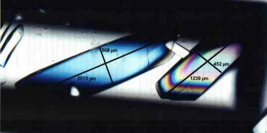 Photograph of Bence-Jones protein crystals from a human cancer patient grown on STS-80 in ITA's Liquids Mixing Apparatus (LMA). These crystals may provide key data in the development of selective drug therapy delivery.